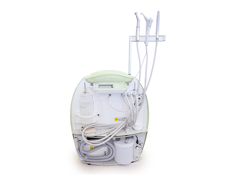 院内の診療ユニットの機能をそのまま持ち運びできるようにした物で、歯を削る道具や超音波の歯石除去、風や水が出る3Wayシリンジの他、お口の中の水を吸うバキュームもセットされています。