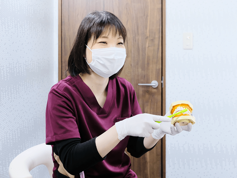 正しいセルフケアができるように、適切な歯の磨き方、歯ブラシの選び方やデンタルフロスの使い方などをお伝えしています。セルフケアの質を高めることは、将来的に歯の寿命を延伸させる上で最も重要です。